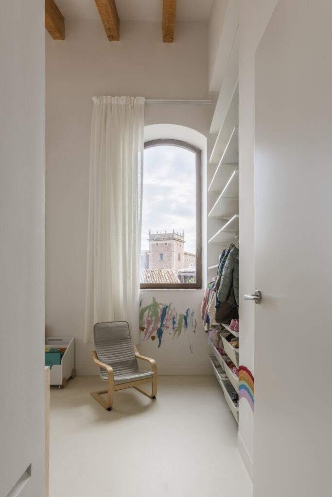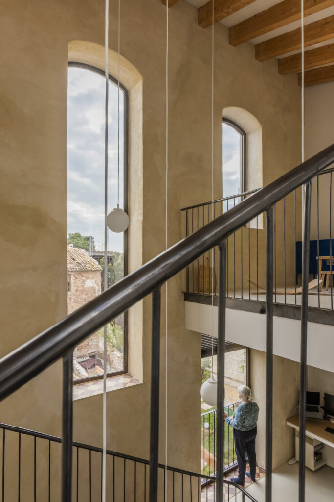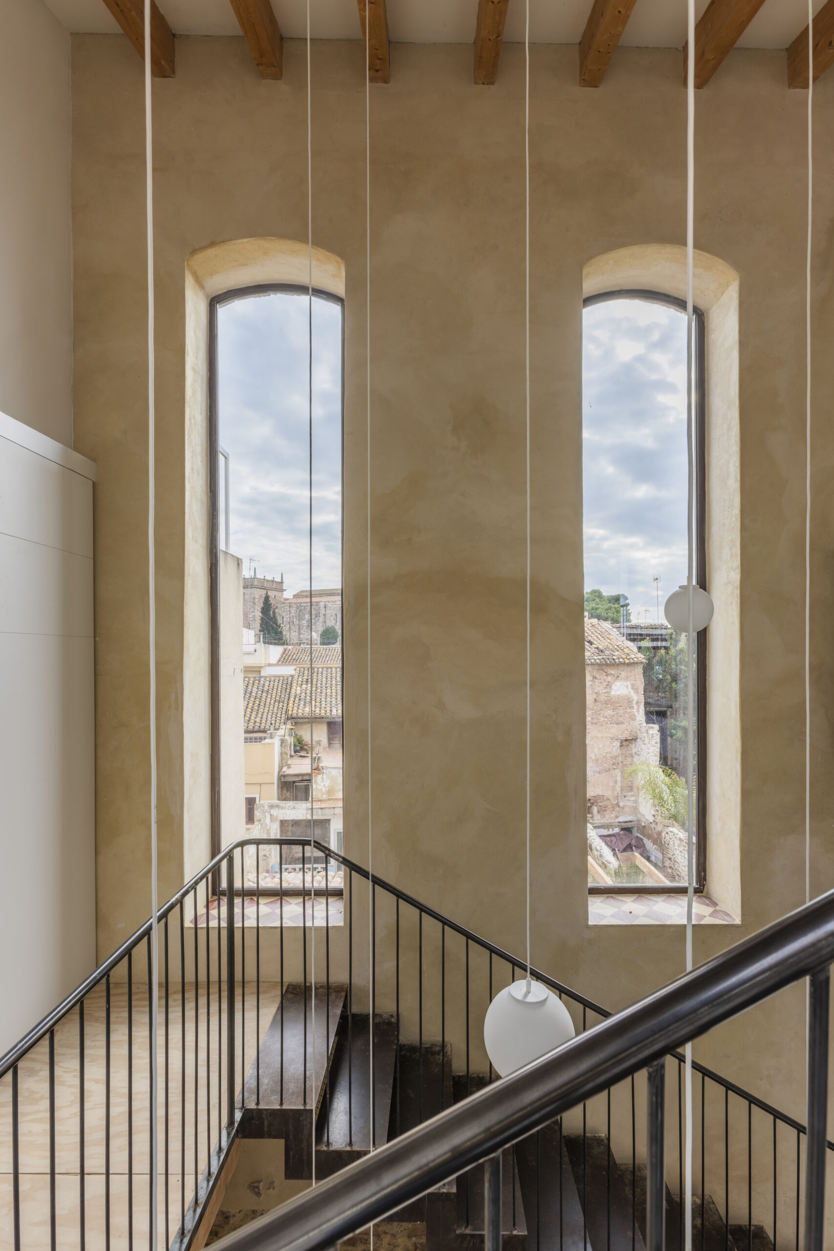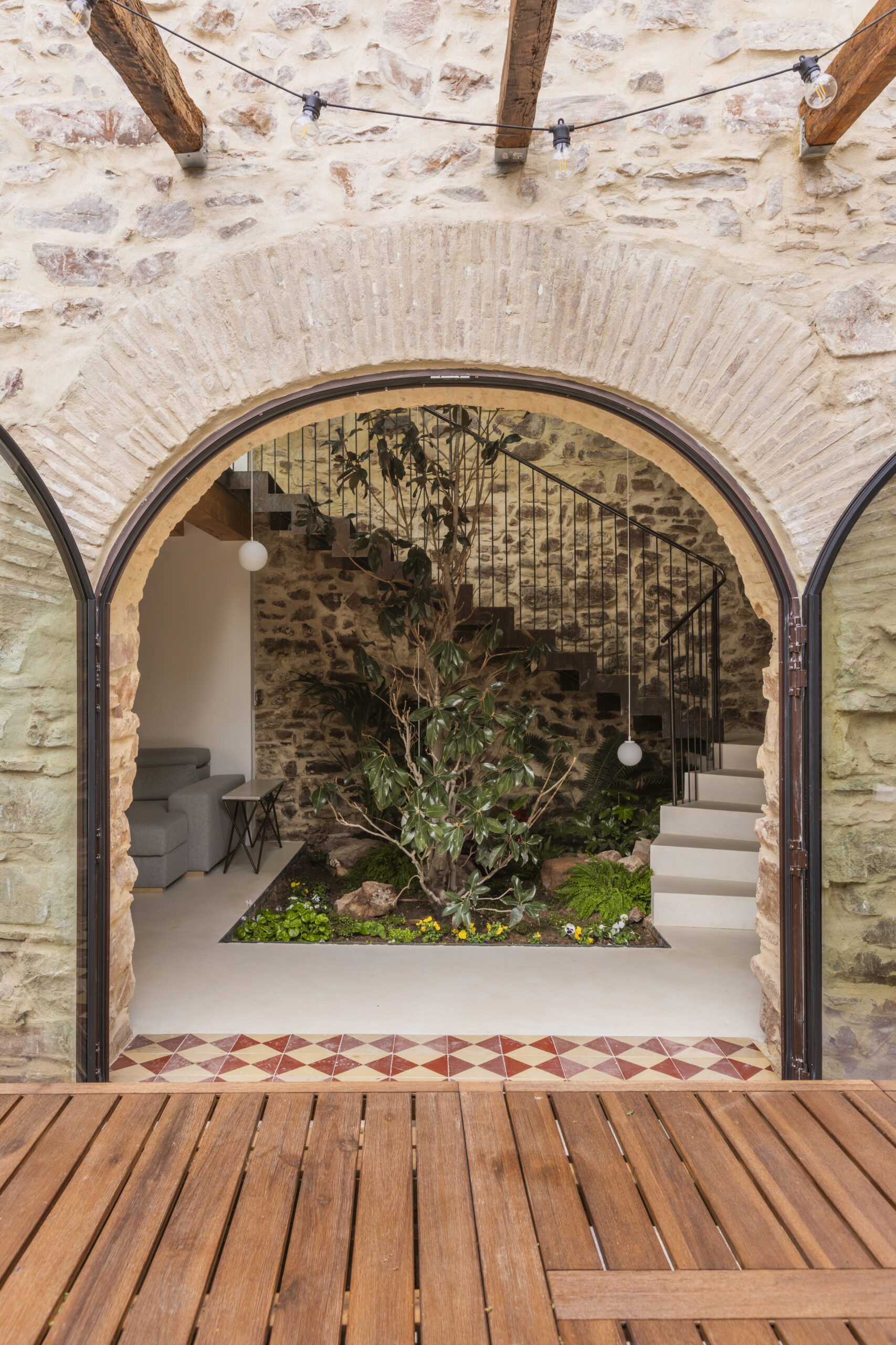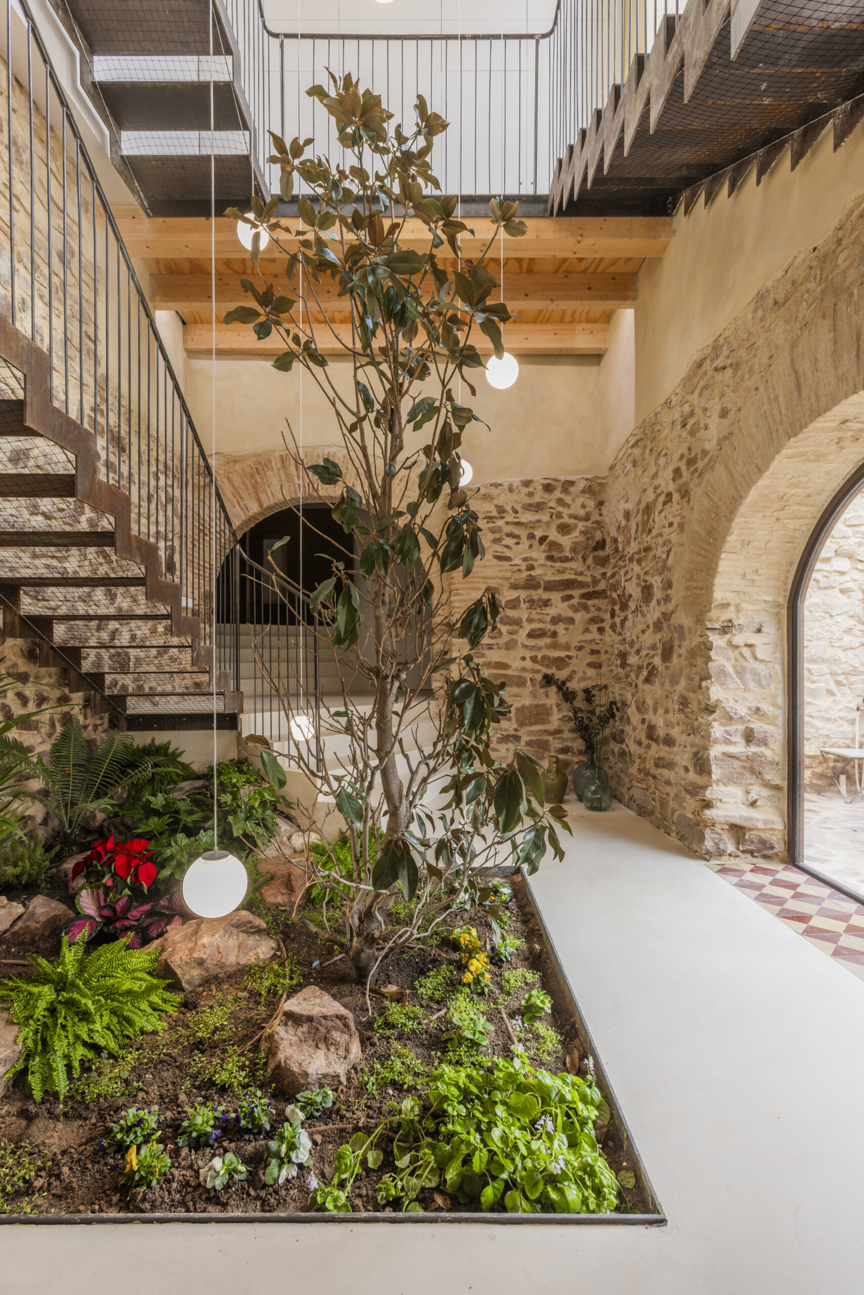 Desde la entrada de la calle de Dalt se desciende a través de una serie de arcos a la planta subsuelo iluminada por la luz cenital de la triple altura, enmarcada ésta, con un jardín interior presidido por el magnolio que distribuye los cinco niveles de la vivienda. La composición organiza alturas escalonadas y vacíos estratégicos, modulando la percepción espacial y estableciendo nuevas relaciones visuales hacia el Monasterio y el casco antiguo.
